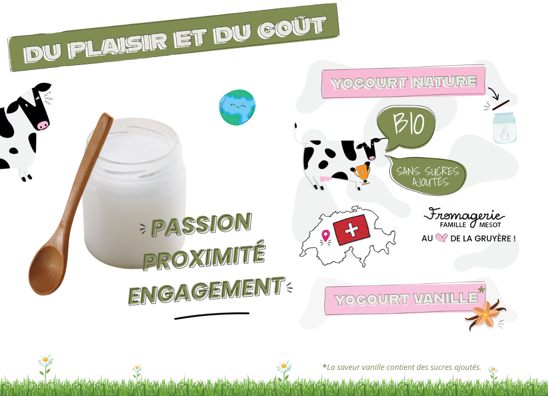 Nos yogourts proviennent exclusivement de la Fromagerie Mesot à Bulle (Fribourg). Entre production et consommation, il n’y a que quelques kilomètres, pour un maximum de fraîcheur.